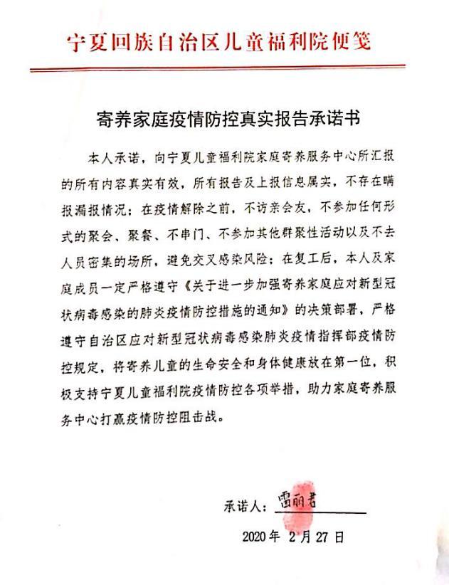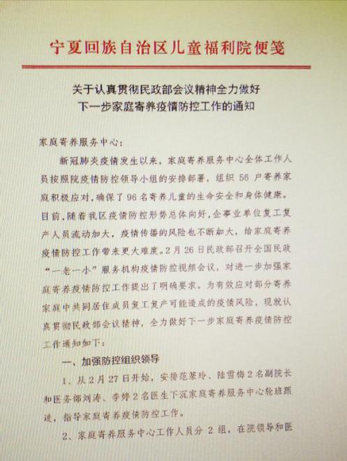 为积极应对寄养家庭中共同居住成员复工复产可能造成的疫情风险,根据2月26日民政部召开的全国民政“一老一小”服务机构疫情防控视频会议,对进一步加强家庭寄养疫情防控工作提出了明确要求,自治区民政厅关于印发《全区民政服务机构新冠肺炎疫情防控具体措施(第二版)》,对家庭寄养疫情防控工作做了新部署。宁夏儿童福利院党总支积极响应落实,安排2名副院长和2名医生轮流在家庭寄养服务中心值守。在原《家庭寄养防疫措施》基础上,根据复工复产这一疫情防控实际需求,进一步优化了寄养家庭分组包户到人、摸清复工底数、排查风险等级、增补防疫物资、应急事件处置、关爱支持服务、舆论宣传引导等18条应对“新冠”疫情复工复产防控措施。