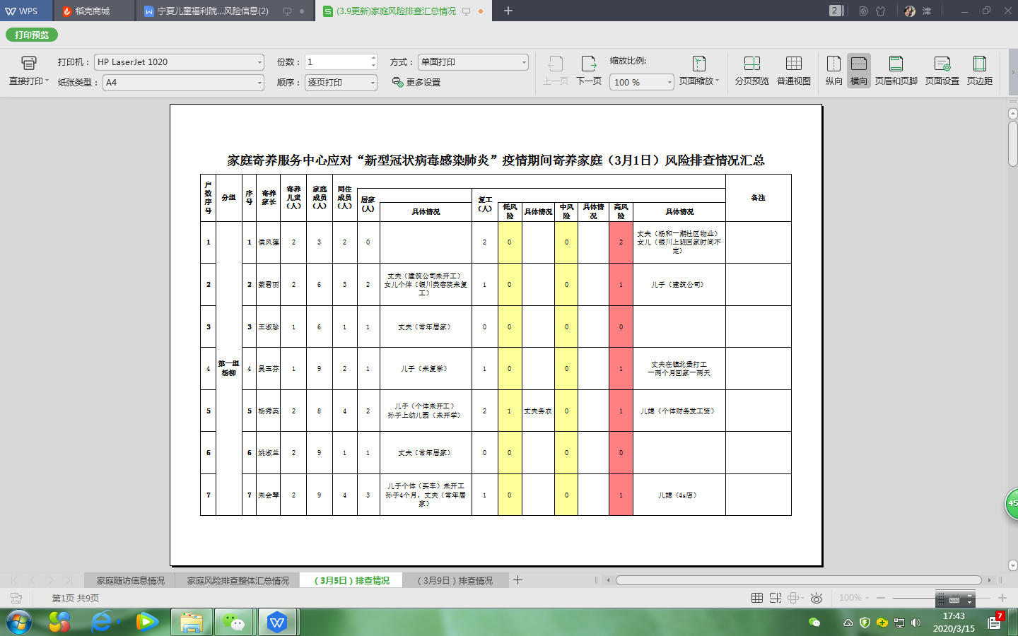 为落实防控措施,中心从细处着手,详细摸底寄养家庭成员及共同居住人员信息,掌握共同居住人员复工复产情况,做到底数清、情况明。截至目前,58户寄养家庭共有家庭成员391人,其中共同居住176人;复工复产人数47人,占共同居住人数的27.8%。通过摸排了解到寄养家庭成员的工作性质较为复杂,其中有从事农业生产的,有从事门卫、保安、公交司机等接触人员较多职业的,也有到疫情中风险地区工作的人员。中心将从事农业生产定为低风险;非聚集性企业工作为中风险;聚集型企业、服务业或到居住地以外仍存在疫情地区工作的为高风险等级。通过摸底了解,中高风险等级就有36人,占共同居住复工复产人数的20.5%,中心工作人员尽可能劝解中高风险等级寄养家庭成员推迟复工日期,如不能推迟,要求做好自我防护。同时,加强每日寄养家庭成员复工复产动态数据核对,准确掌握研判。