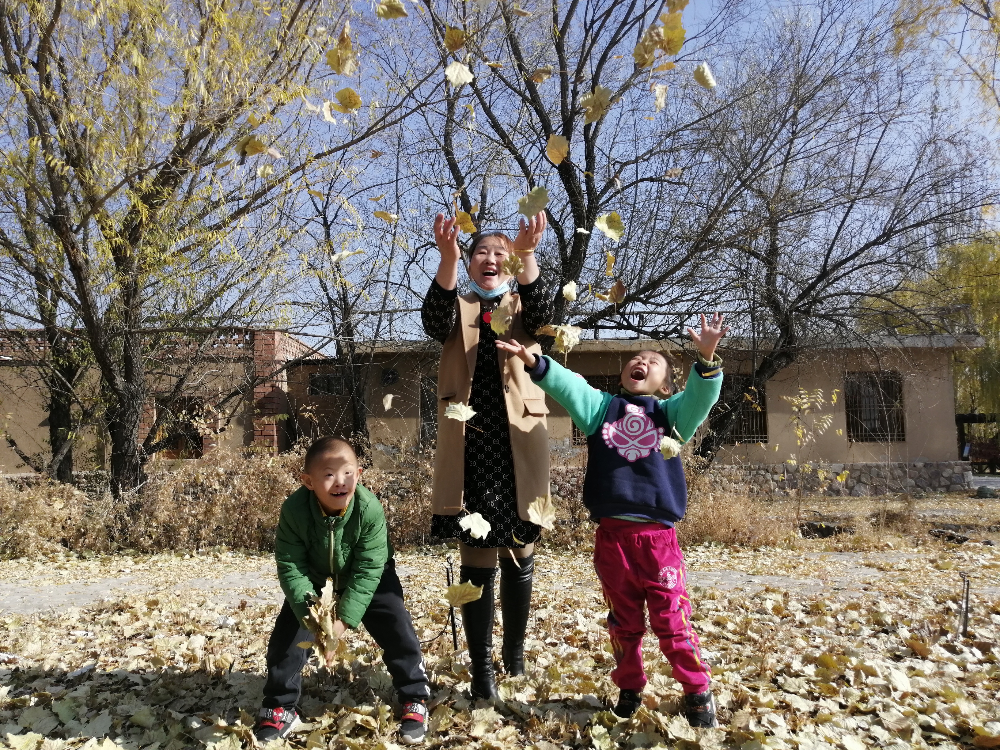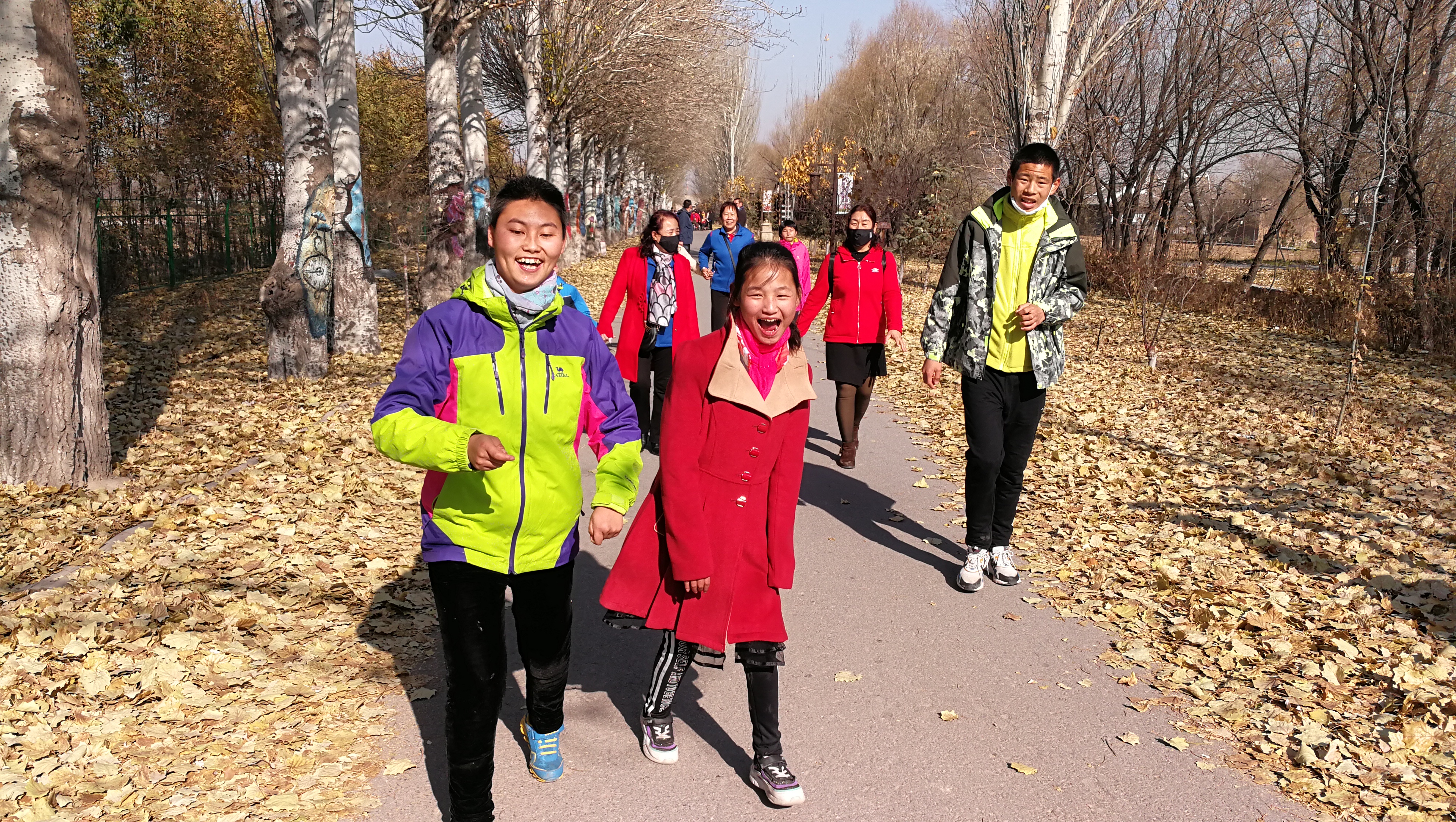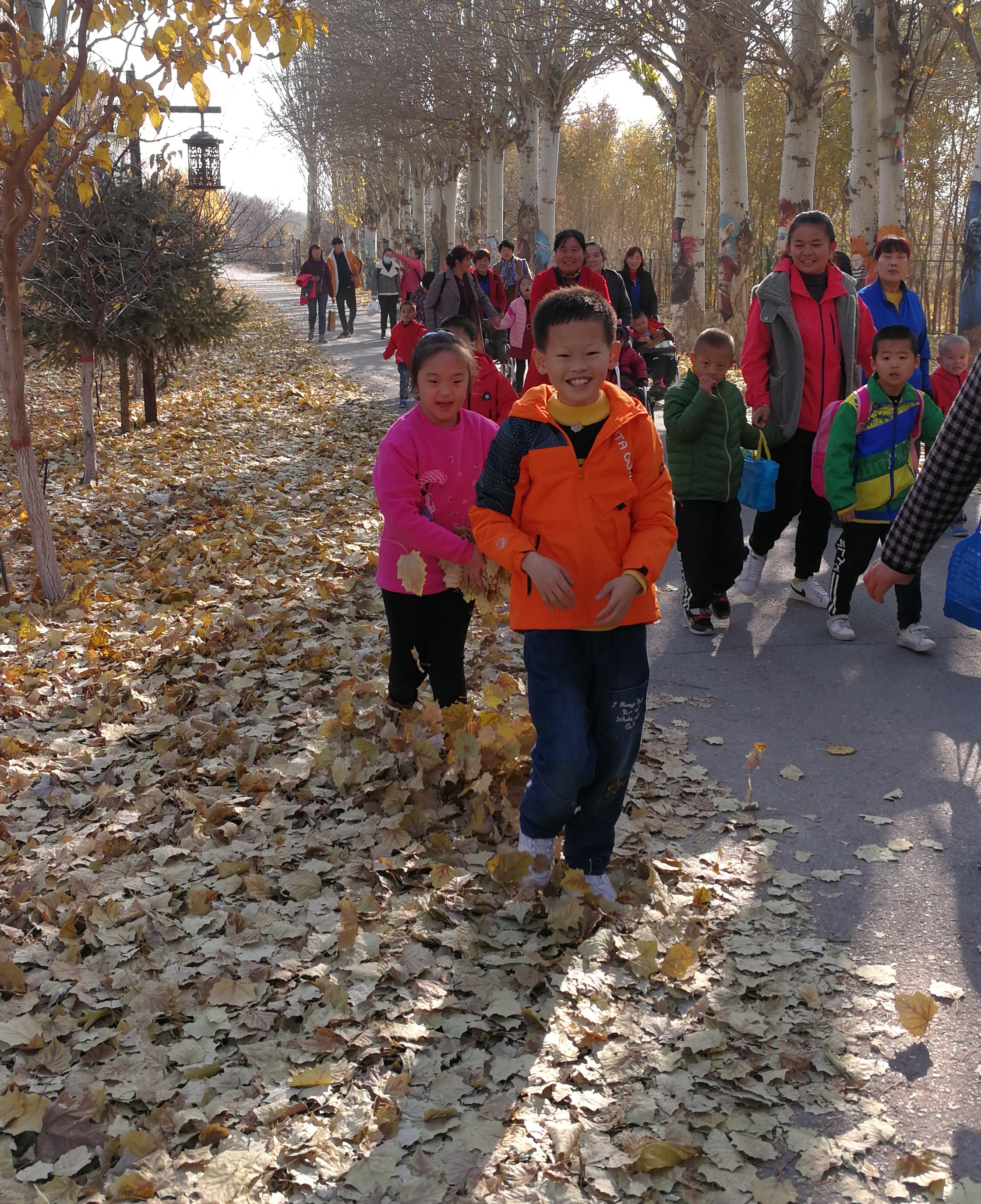 初冬的阳光明媚,天空湛蓝,在妈妈和老师的陪伴下,孩子们踩着满地的落叶,欢呼雀跃、自由奔跑,孩子们的天性得到了释放,每一个人的脸上都洋溢着开心的笑容。