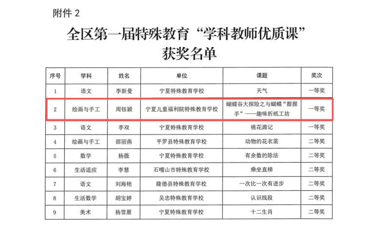 近日,宁夏儿童福利院特殊教育学校周钰颖老师《蝴蝶谷大探险之与蝴蝶“握握手”趣味折纸工坊》参赛课例,荣获全区第一届特殊教育教师课堂教学“四课”比赛“学科教师优质课”竞赛一等奖。