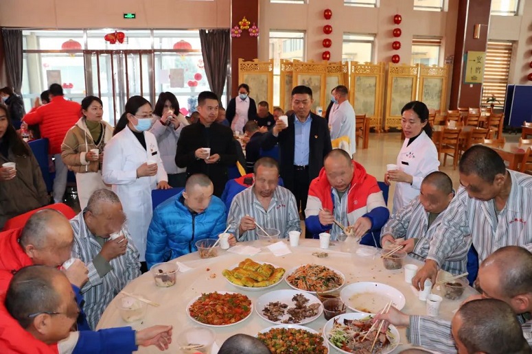 活动现场灯笼高挂、饭香扑鼻,浓浓的年味,让康复患者感受着祥和热闹的节日氛围,体验到温馨团圆的家庭温暖,同时也体现着党和政府对残疾人的关心关爱。膳食科为康复患者精心准备了丰盛年夜饭,你看,手抓羊肉,“抓”来衣食无忧;宫煲鸡丁,“煲”护他们一路前行;北京烤鸭,“烤”出健康快乐。当然,还有象征团圆的水饺,一口下去温馨暖意,康复患者在这个充满爱心的大家庭里共叙家常,场面温馨,犹如一家。