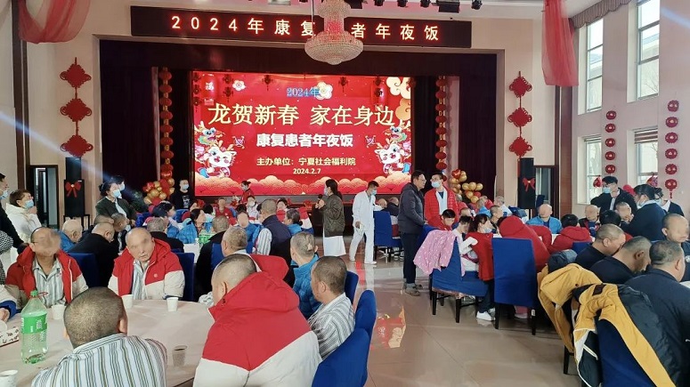 在新春佳节来临之际,为了使康复患者在节日期间感受家庭温暖,2月7日,宁夏社会福利院为他们举办了2024“龙贺新春 家在身边”年夜饭暖心活动。宁夏社会福利院党总支书记、院长郭朝东出席活动并致新年贺词。