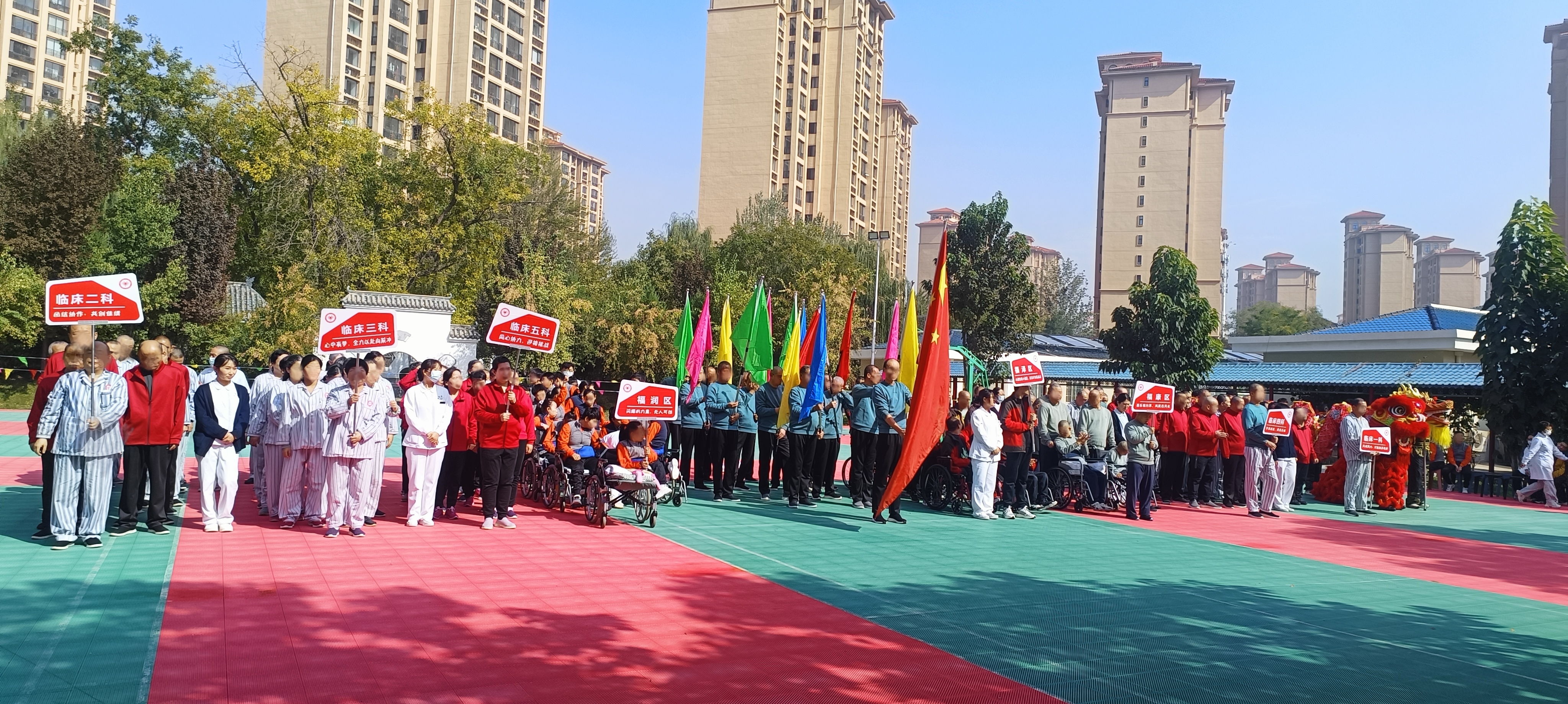 伴随激昂的《运动员进行曲》,各临床科室方阵迈着整齐的步伐依次入场,精神抖擞的姿态尽显蓬勃朝气。其中,孤残青年群体的身影尤为动人 —— 他们中,有人坐着轮椅前行,有人在医护人员的细心搀扶下缓缓迈步。即便受肌张力影响,动作协调性稍弱,他们仍用响亮的口号、灿烂的笑容,将生命的韧性与康复的信心定格成赛场上最耀眼的风景。文艺展演环节,宁夏医科大学体育与健康学院带来的《龙腾狮跃闹金秋》率先登场,龙狮翻腾跳跃,锣鼓声铿锵有力,将金秋的喜庆与活力洒满全场;随后,康复患者们的律动操表演温情接续,他们伴着节奏舒展肢体,每一个动作都透着认真与坚定。一刚一柔的表演,既营造了热烈欢腾的氛围,更满含着对康复患者的深切鼓励与美好祝愿。