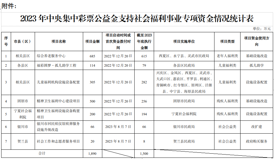 按照财政部、民政部《关于提前下达2023年中央集中彩票公益金支持社会福利事业专项资金预算的通知》(财社〔2022〕130号)和《关于下达2023年中央集中彩票公益金支持社会福利事业专项资金预算的通知》(财社〔2023〕62号),共下达我区2023年中央集中彩票公益金支持社会福利事业专项资金1890万元。