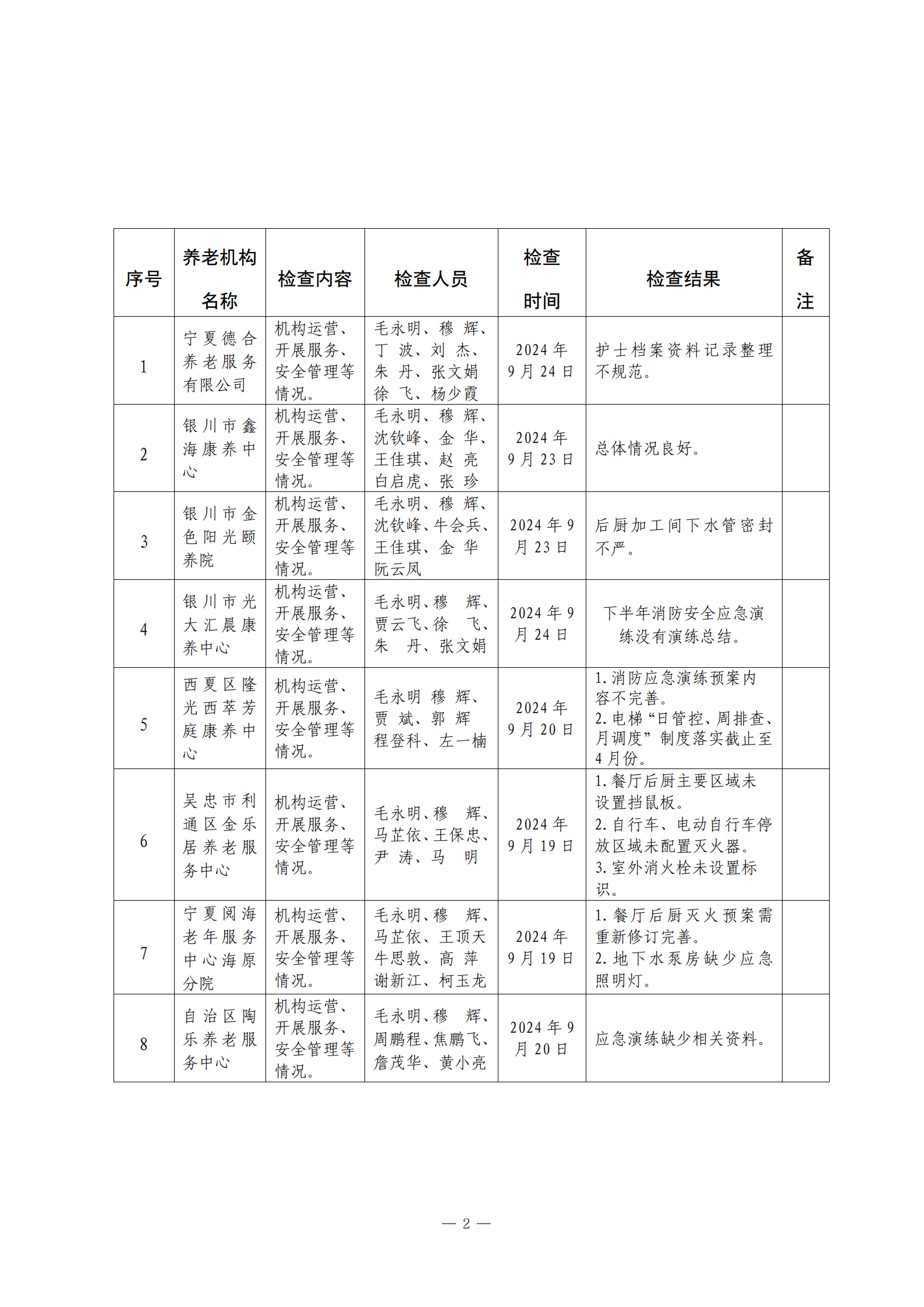 根据自治区民政厅、住房和城乡建设厅等5部门《关于印发〈关于推进全区养老服务机构“双随机、一公开”监管工作的实施方案〉的通知》(宁民发〔2022〕55号)要求,按照年初制定的年度抽查工作计划,自治区民政厅依托宁夏回族自治区“双随机、一公开”综合监管平台随机抽选了8家养老机构,联合属地应急管理、消防救援、市场监管、卫生健康等部门对随机抽选的养老机构进行了联合实地检查,现将检查结果公示如下: